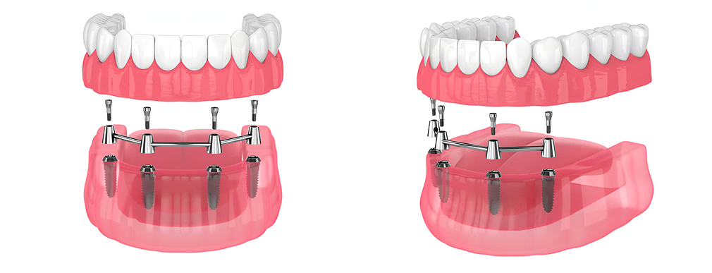 For patients who don’t want dentures that come out, there is the fixed option. This approach allows the prosthesis to be fixed to the implants and can only be removed by the dentist. They are designed to allow easy cleaning and maintenance.